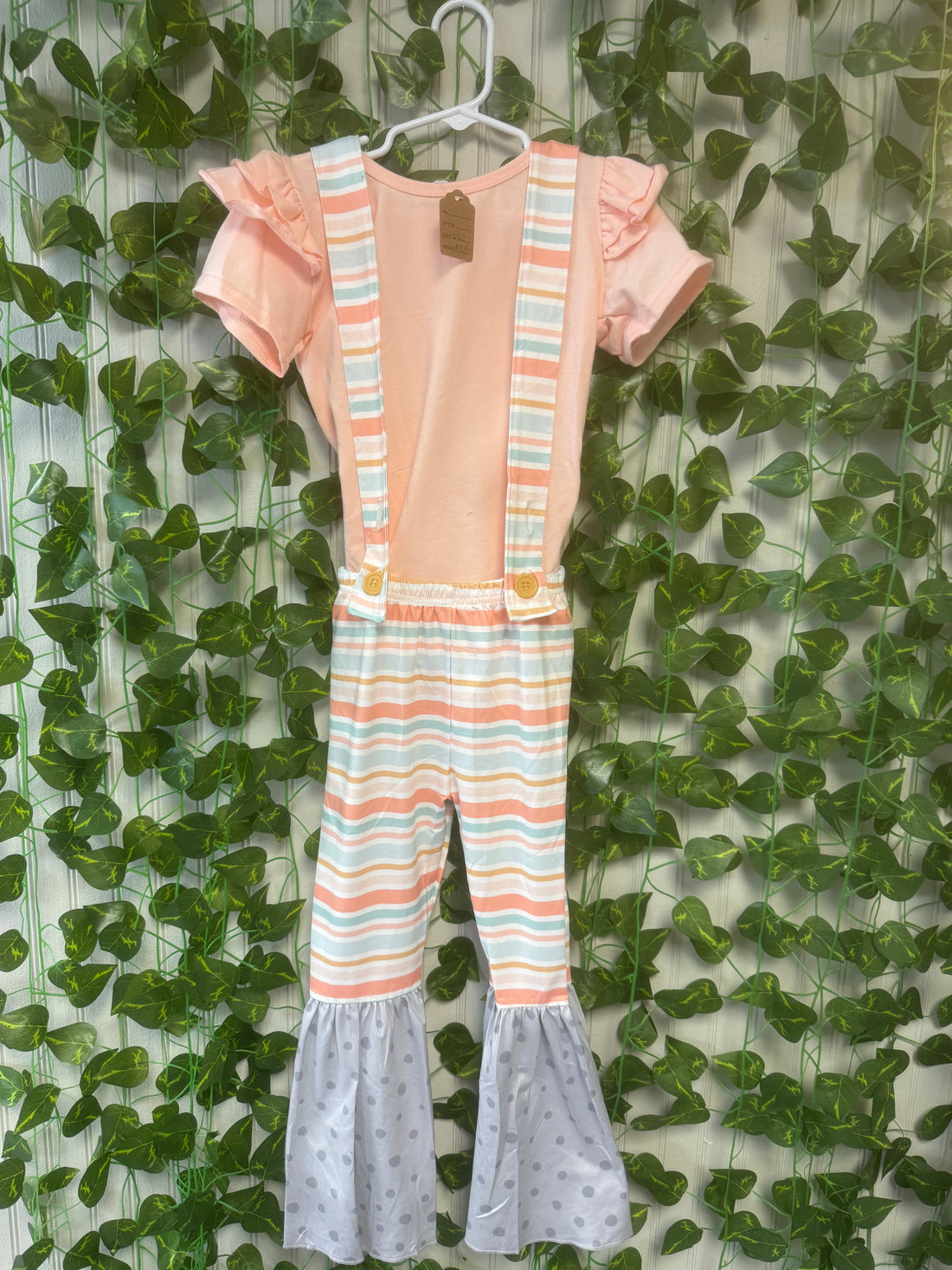 Adorable polka-dot romper featuring contrast ruffle trim, button detail, and flared ruffle legs. Soft, comfy,...