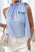 Elevate your wardrobe with this Tied Knot Frilled Top, perfect for both casual outings and dressy events. Its classic striped pattern and sleeveless cut offer timeless style, while the unique tied knot detail adds a flattering, eye-catching touch. Pair it effortlessly with white jeans or mini skirts to create a chic, standout look that turns heads wherever you go.