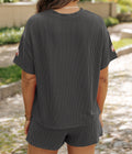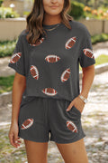Show your passion for football with the Carbon Grey Football Ribbed Set July. This stylish two-piece outfit features a loose tee and matching shorts adorned with dazzling football sequin patches. Crafted from quality fabric with a chic twisted rib texture, it offers both comfort and a trendy look perfect for game day or casual wear.