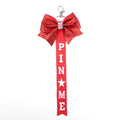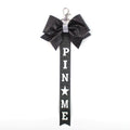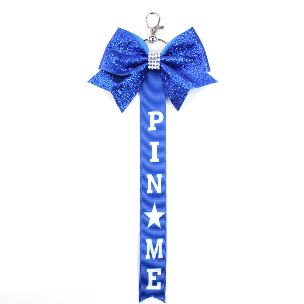 This Cheer Pin Me Ribbon Keychain is made with a customizable design, featuring rhinestones and a cheerleader bow theme. It serves as a stylish backpack charm and sport accessory.