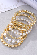 Elevate your everyday style with our Gold Pearl Layered Bracelets LT. These minimalist bracelets feature delicate gold chains and lustrous pearl accents, designed to be worn together for an effortlessly chic look. Perfect for adding a touch of elegance to any outfit, from casual jeans to business attire. An essential addition to your jewelry collection that transitions seamlessly from day to night.