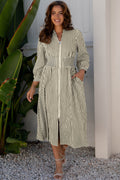 This Green Stripe Cinched Midi Dress features a flattering V-neckline and a convenient zip front closure for easy wear. Its high, cinched waist beautifully defines your silhouette, while the stylish stripes add a modern, trendy touch to your outfit. Perfect for effortless chic on any occasion.