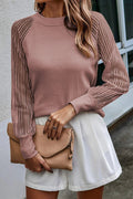 Elevate your wardrobe with the Pink Mesh Ribbed Top July. Featuring sheer striped mesh sleeves, this top adds a touch of romance and allure to any outfit. The ribbed texture enhances its elegance, while the classic crewneck design ensures versatile wear. Perfect for casual days or stylish nights out, this top combines comfort and sophistication effortlessly.
