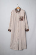Elevate your wardrobe with this striking shirt dress that seamlessly blends pattern and practicality. The pinstriped design creates a flattering, slenderizing silhouette, while bold leopard patchwork adds an artistic edge that commands attention. Cut in a relaxed, flowy fit, this versatile piece transitions effortlessly from day to night. Strategic side slits deliver both comfort and movement, giving you the freedom to style with confidence. Perfect for those who refuse to compromise on style or ease.